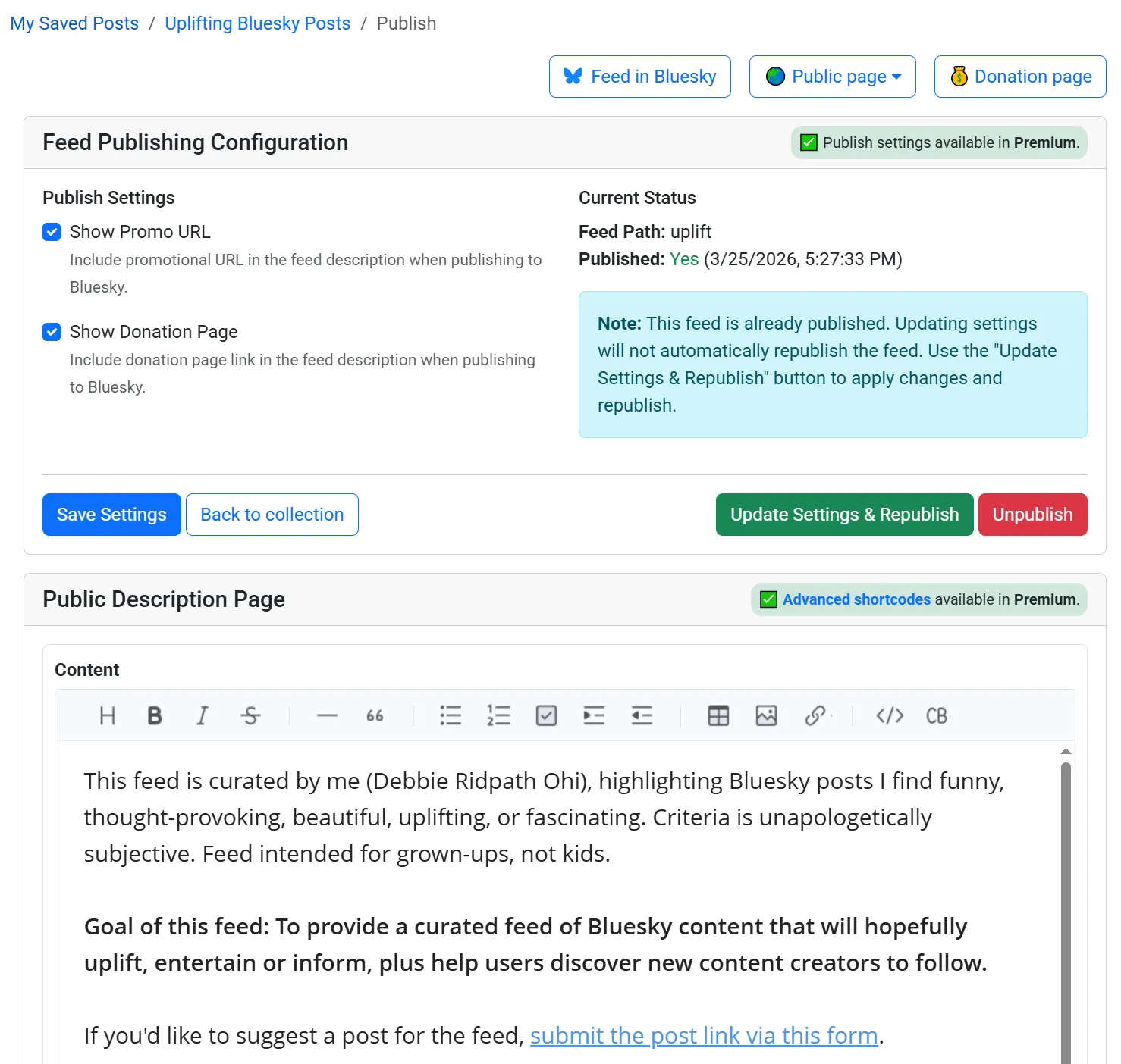If you already have a published feed and you want the updated description to appear on Bluesky, use Update Settings & Republish after saving.